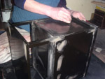 まず、生漆を綿に取り、次の写真のように、ほとんど拭ききるくらいの感覚で薄くムラなく漆を摺りこんでいきます。→摺漆(すりうるし)